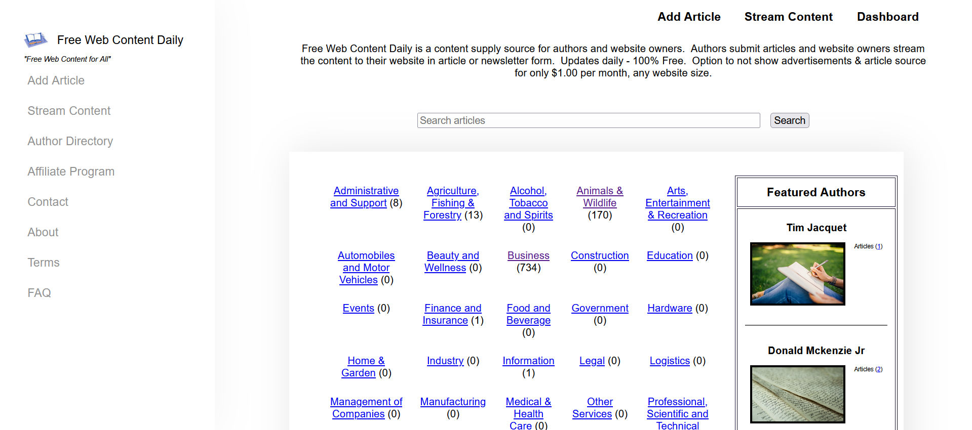 Content supply source for authors and website owners. Authors add articles and website owners stream the content on their website in article or newsletter form. Updates